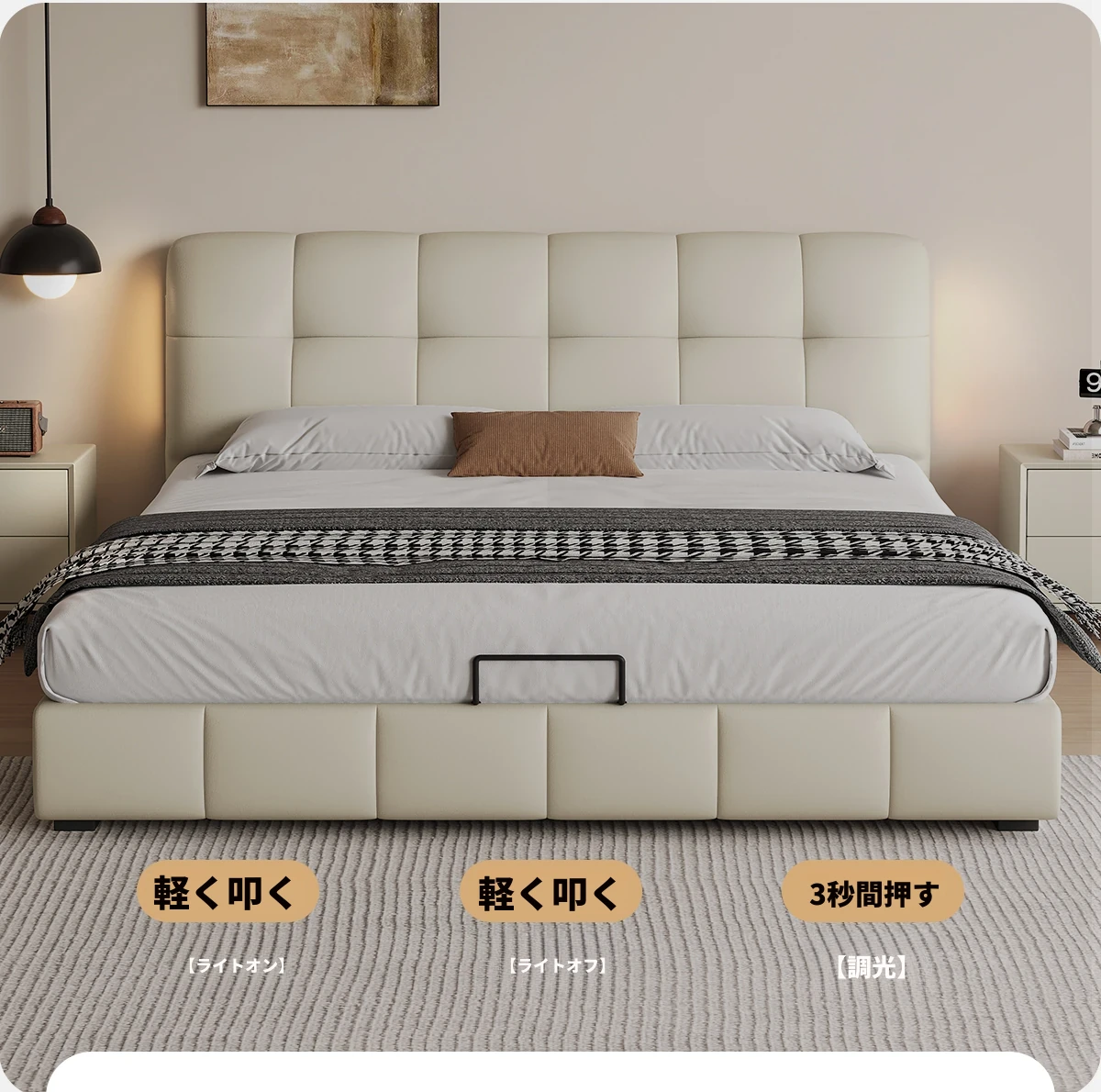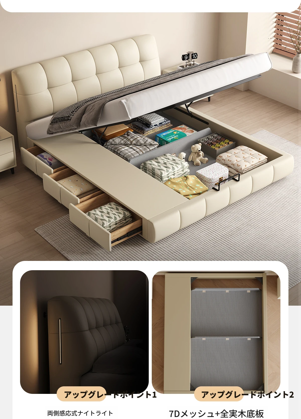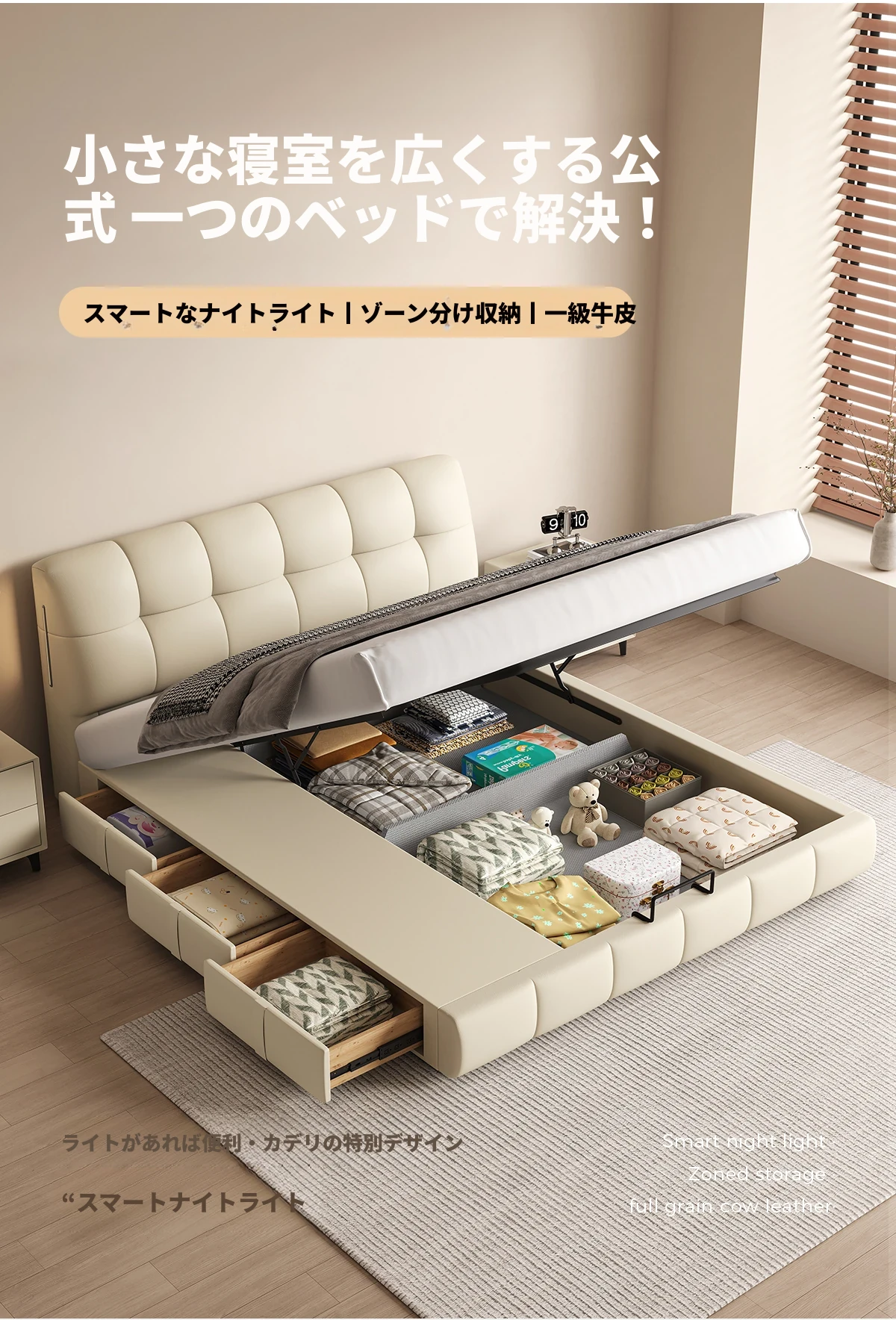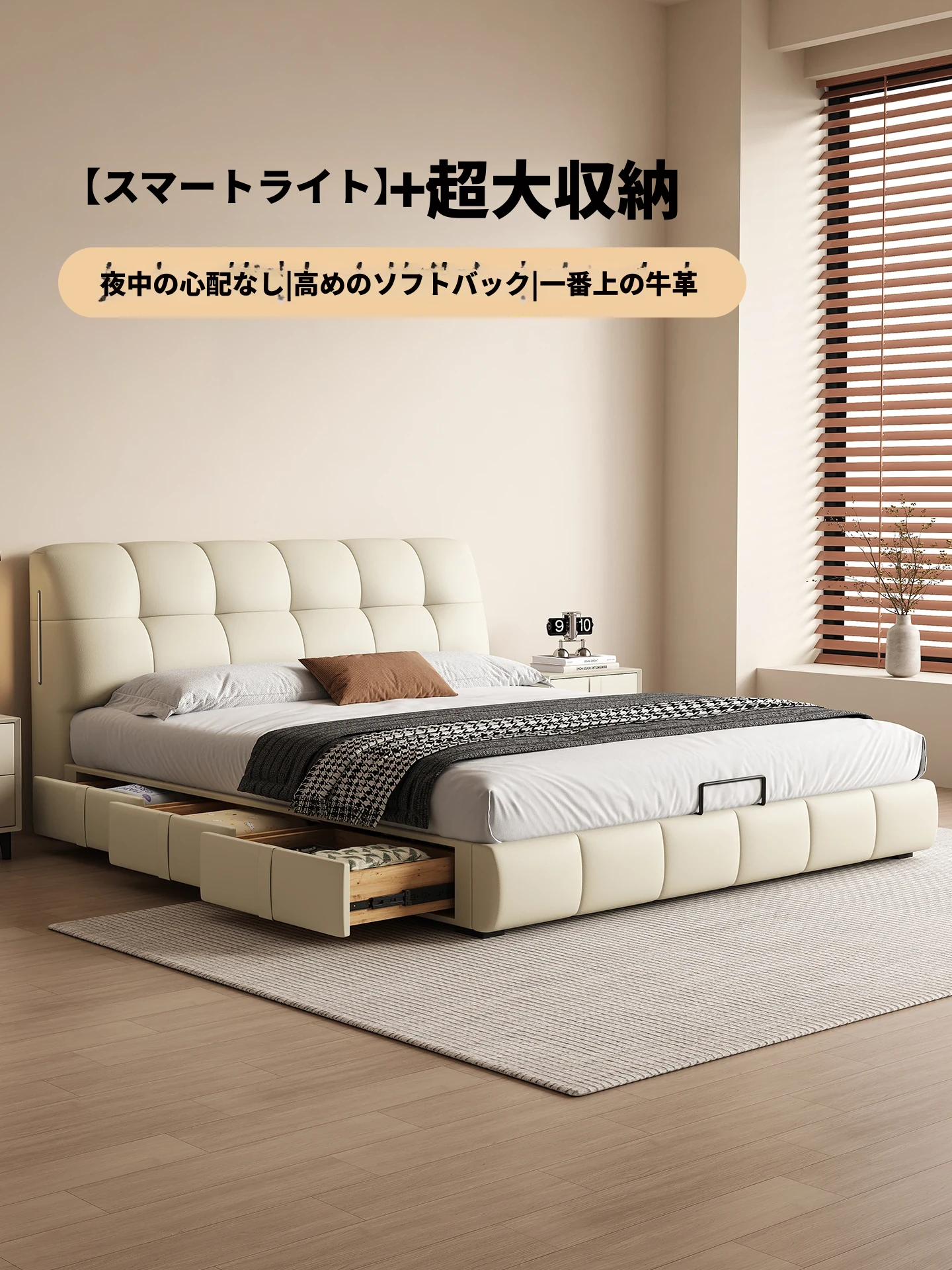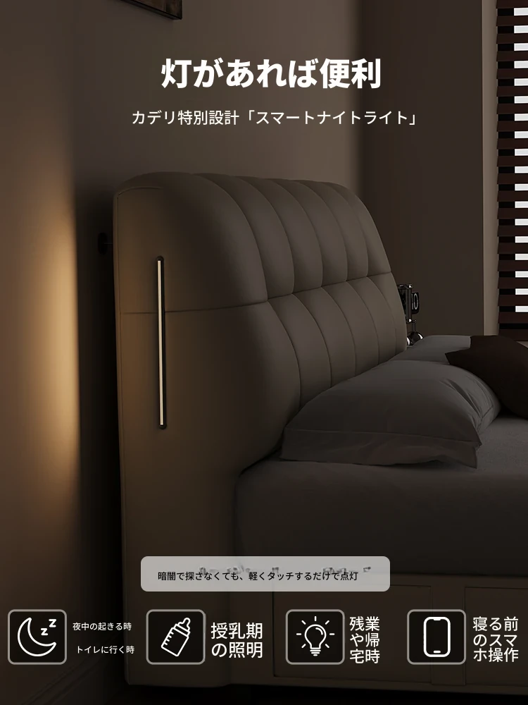 カデリ・シュークリームベッド フランス風クリーム仕立て モダンミニマルデザイン ホワイト本革 大人のダブルベッド 贅沢な収納スペース付き 主寝室にぴったり!
