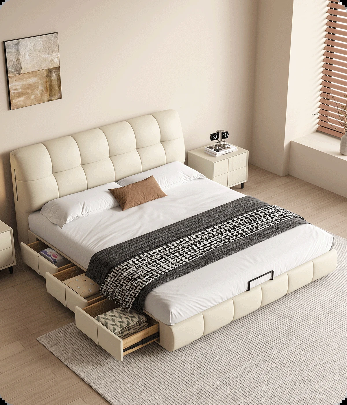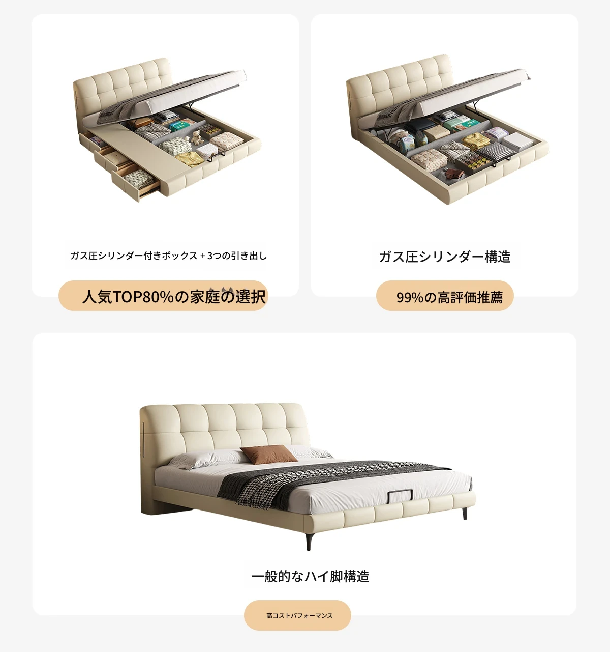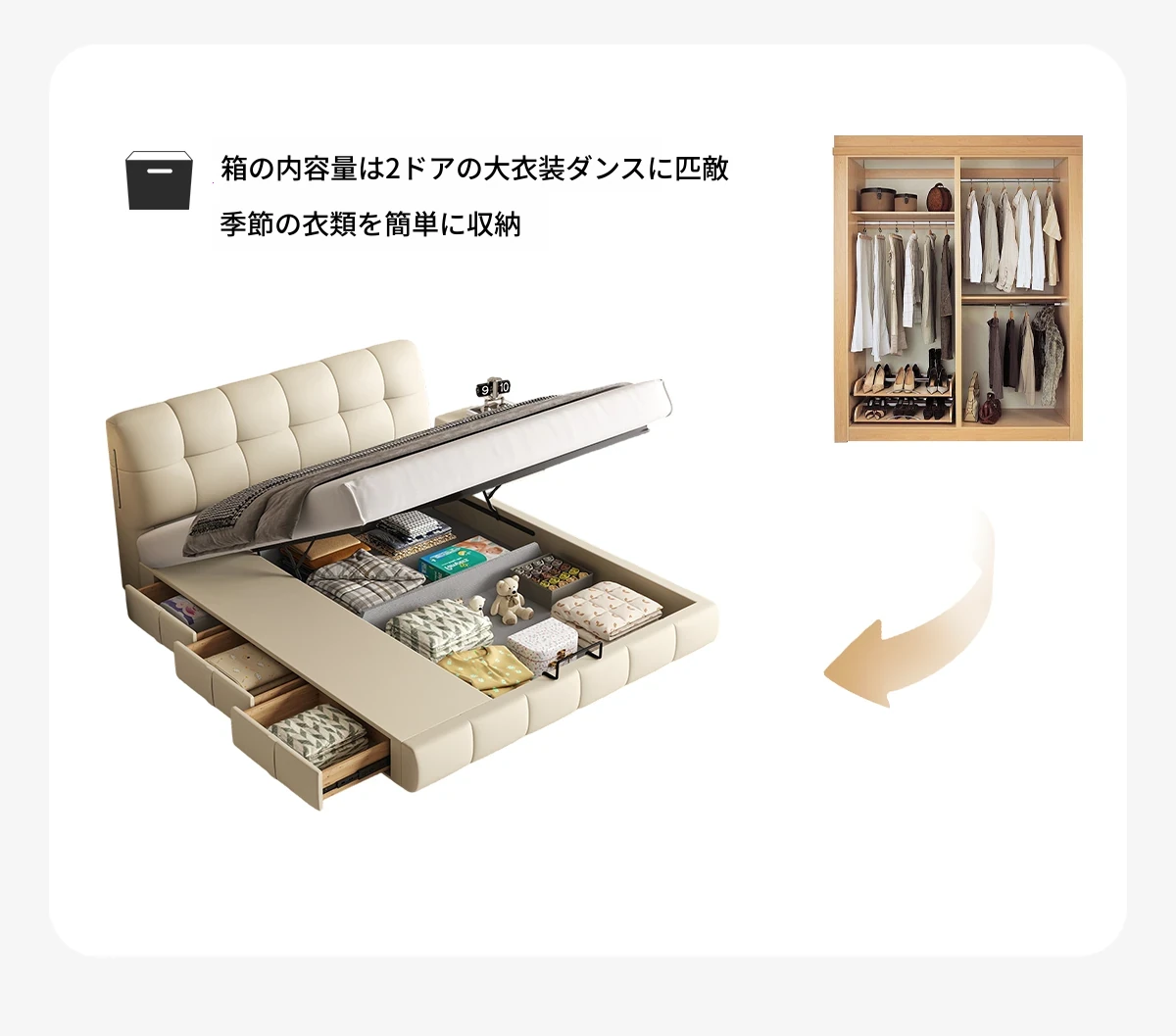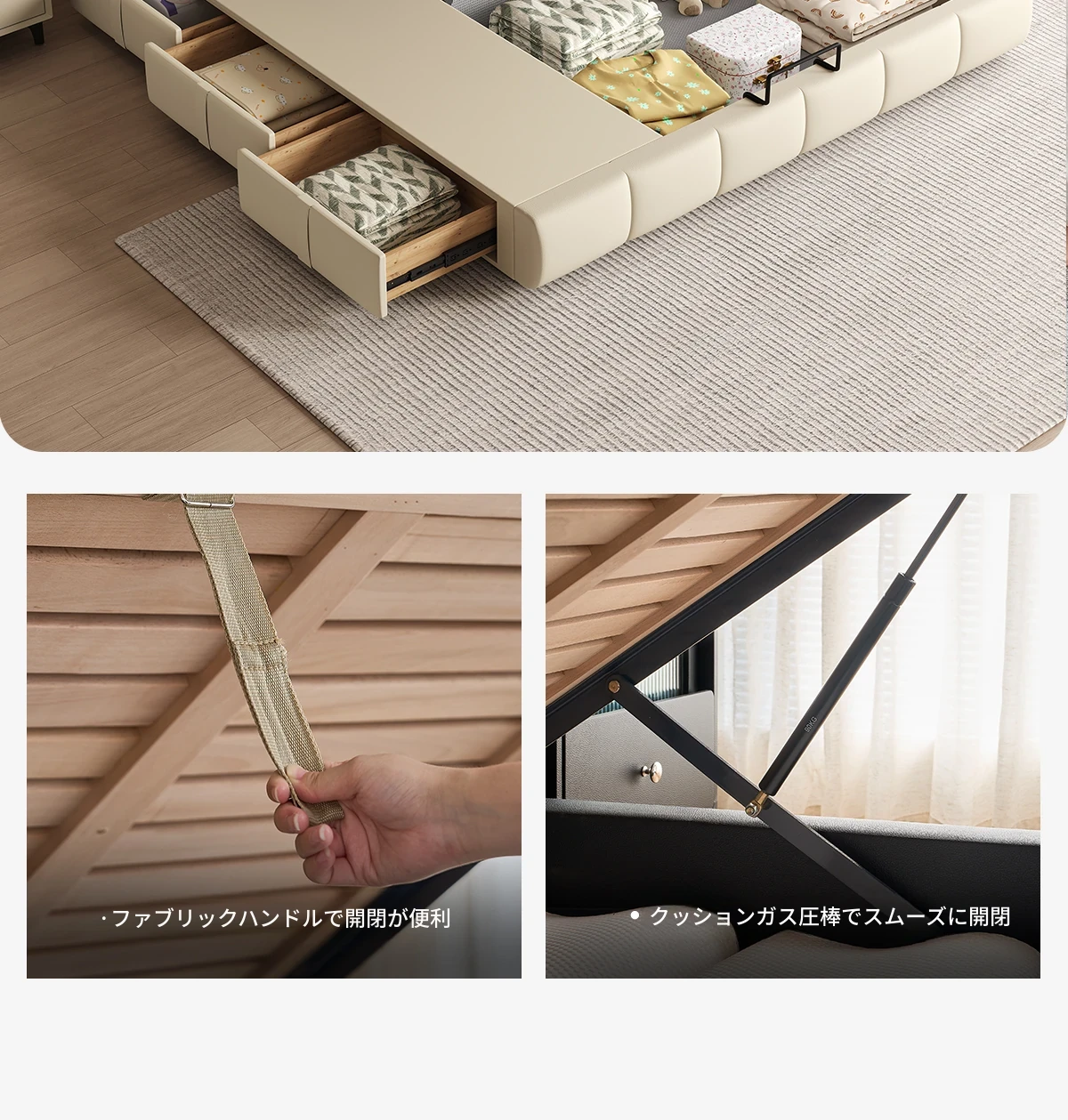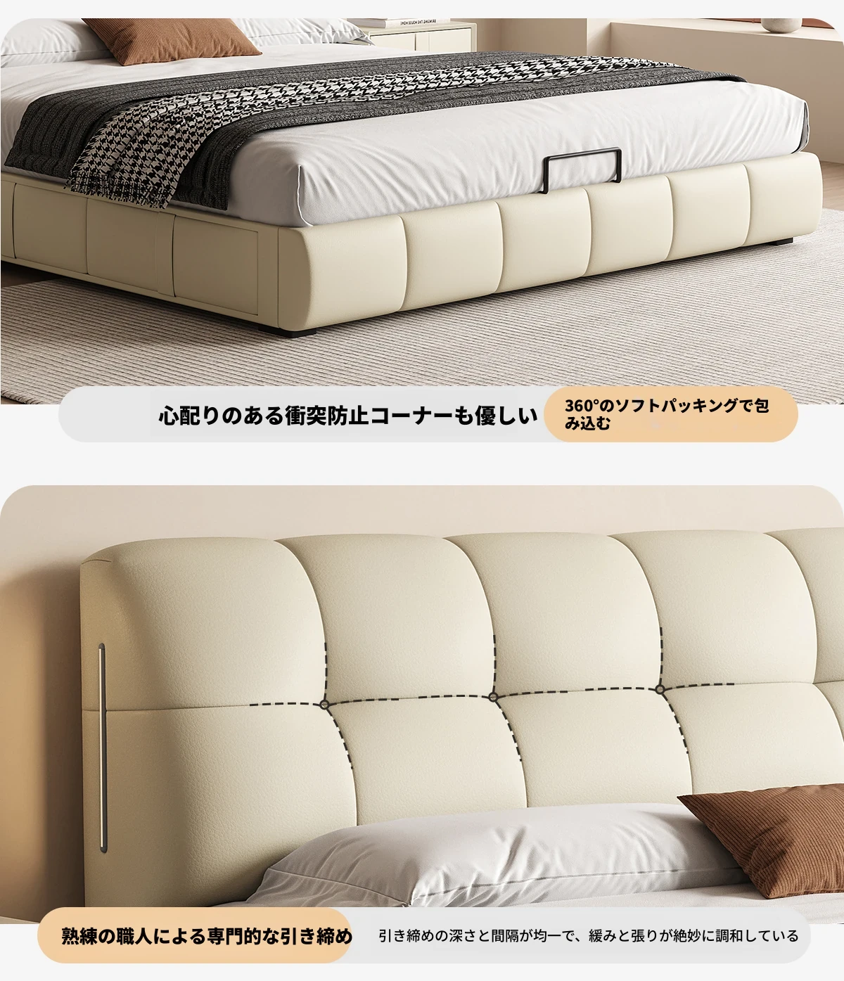 カデリ・シュークリームベッド フランス風クリーム仕立て モダンミニマルデザイン ホワイト本革 大人のダブルベッド 贅沢な収納スペース付き 主寝室にぴったり!