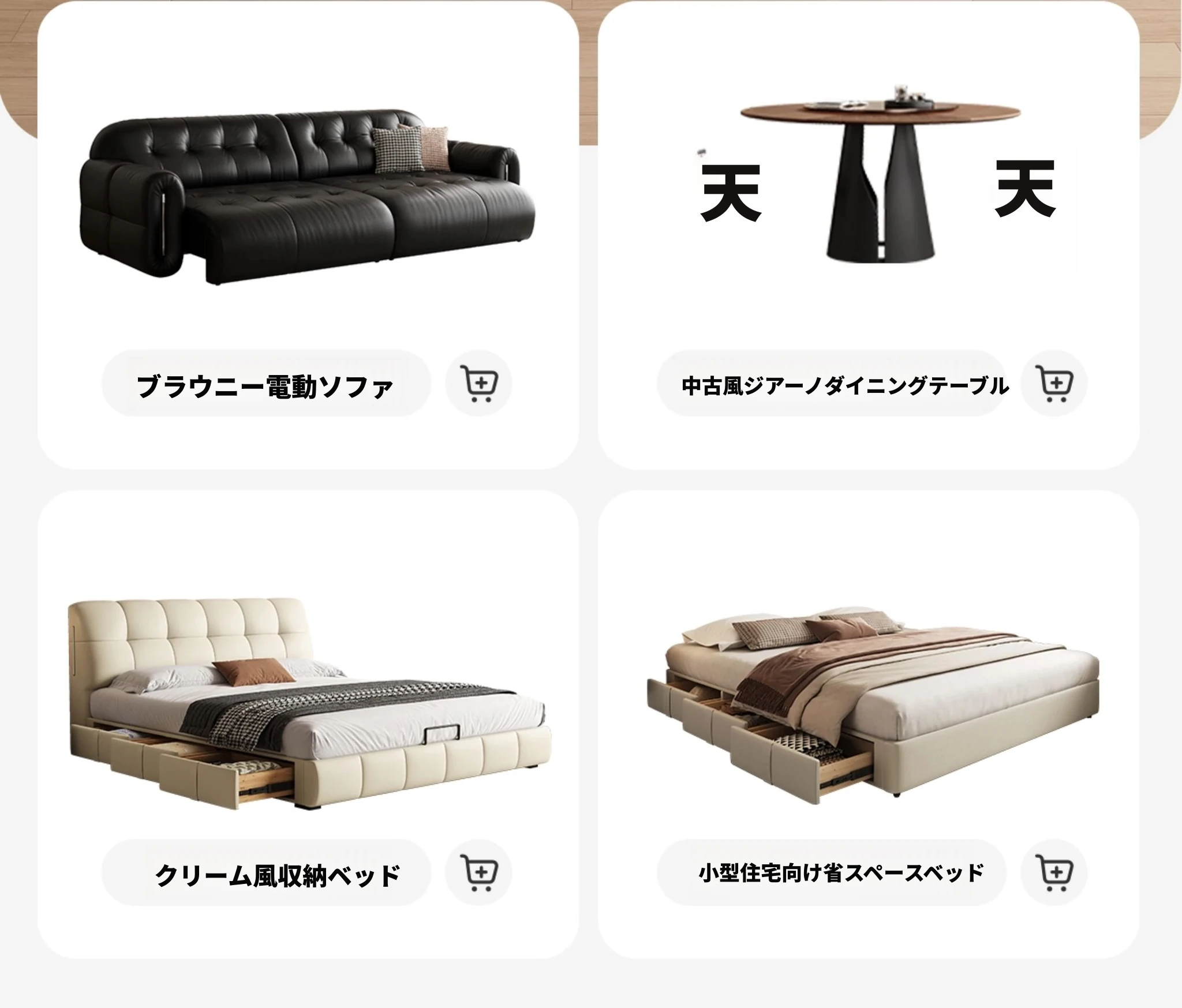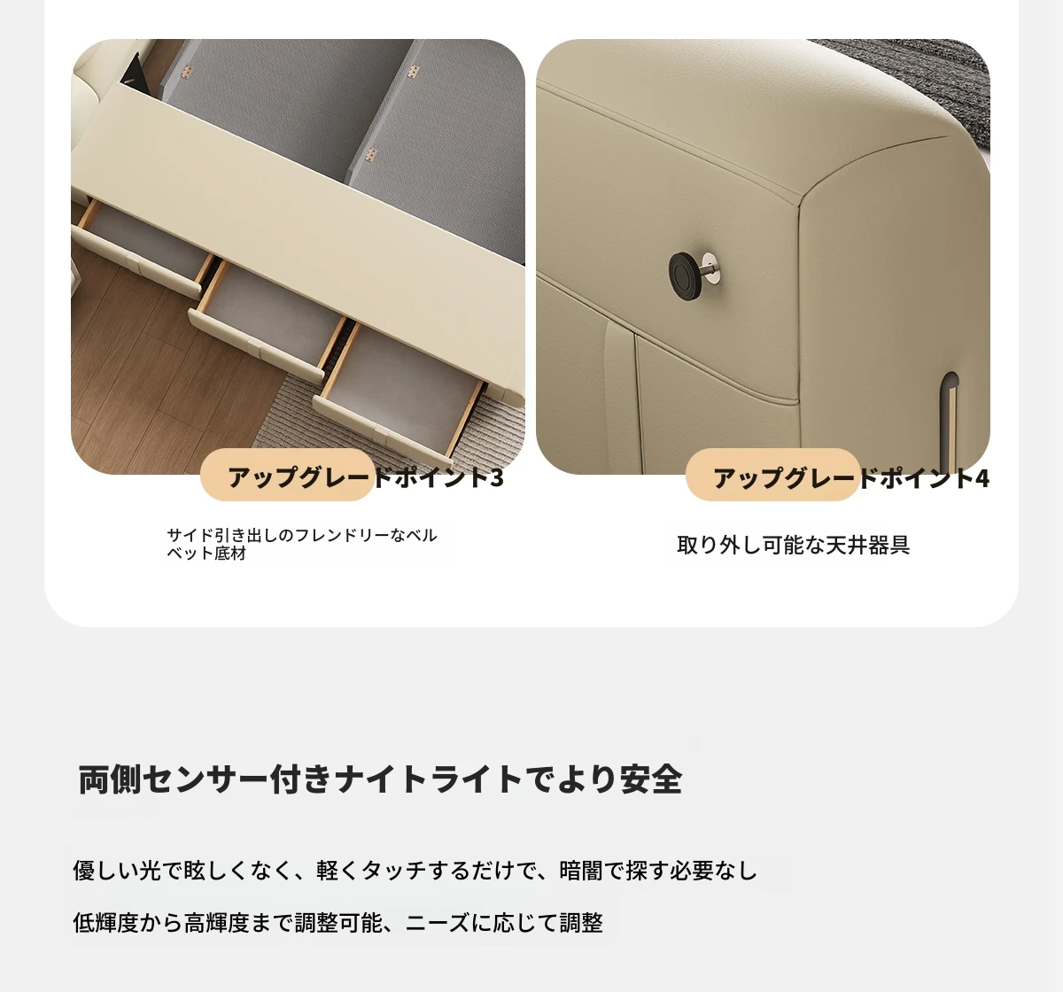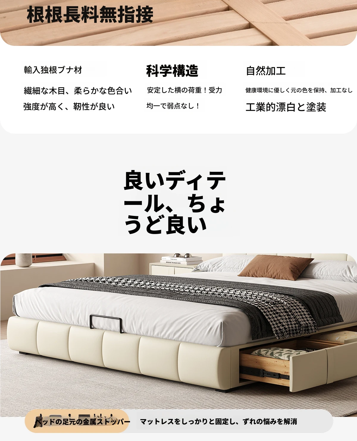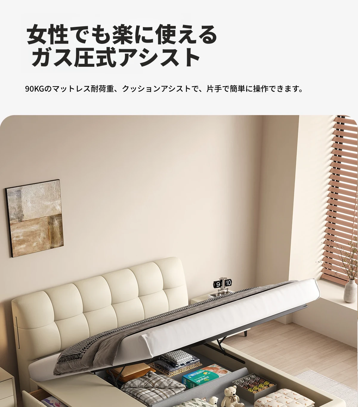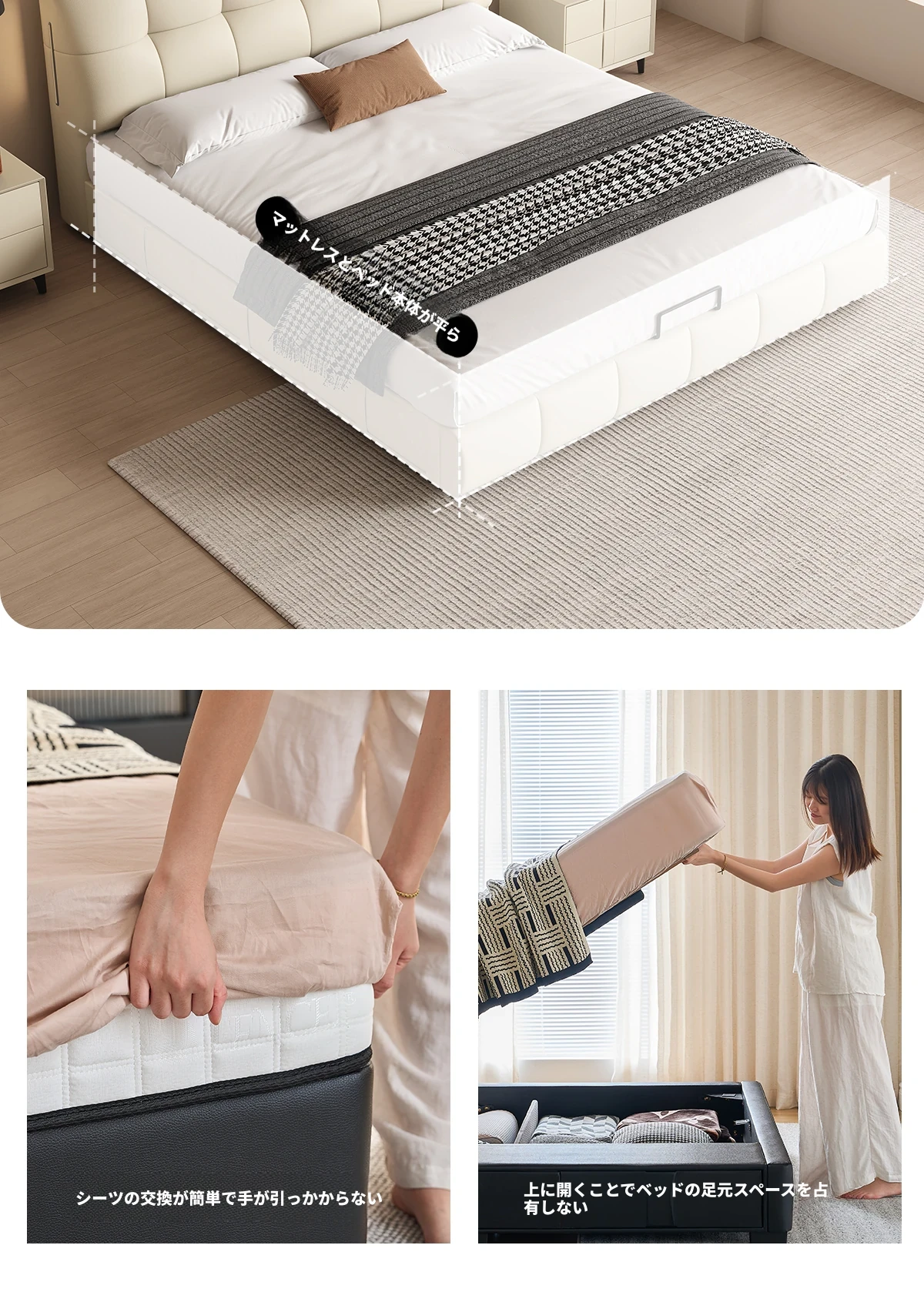 カデリ・シュークリームベッド フランス風クリーム仕立て モダンミニマルデザイン ホワイト本革 大人のダブルベッド 贅沢な収納スペース付き 主寝室にぴったり!