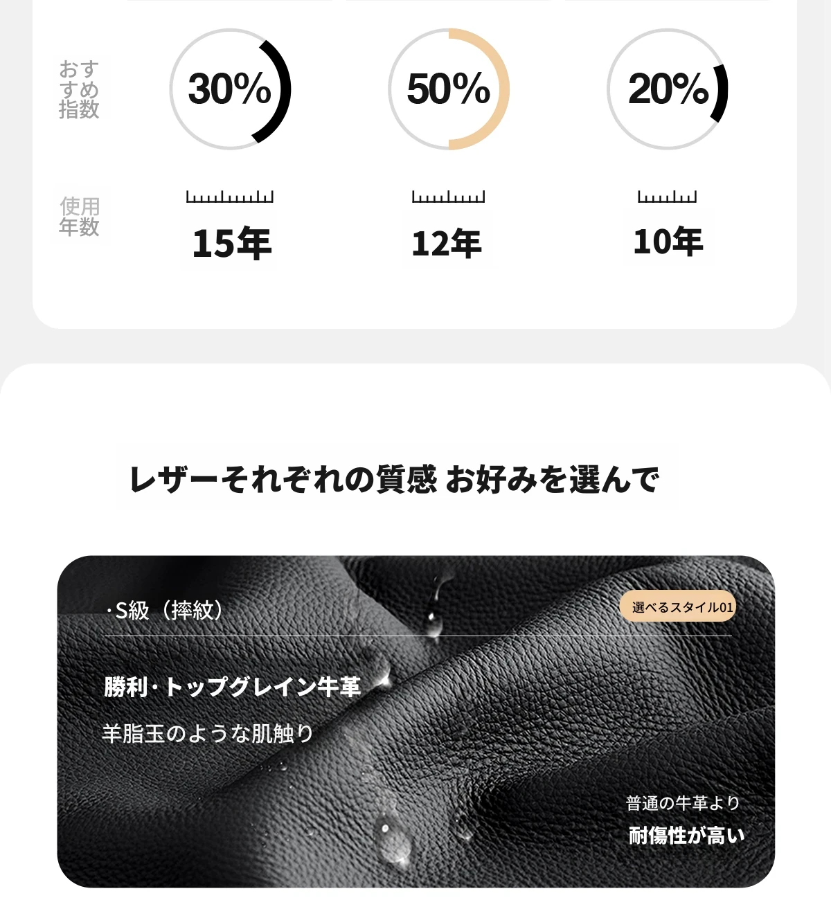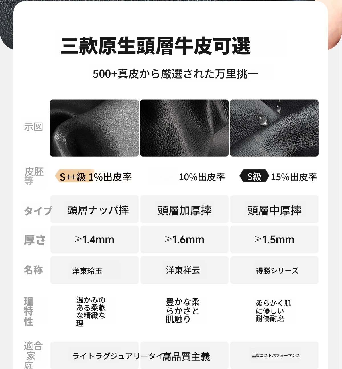 【三種類の原生頭層牛皮】得勝摔紋(耐刮)|祥云摔紋(温潤)|玲瓏玉ナパ(繊細)