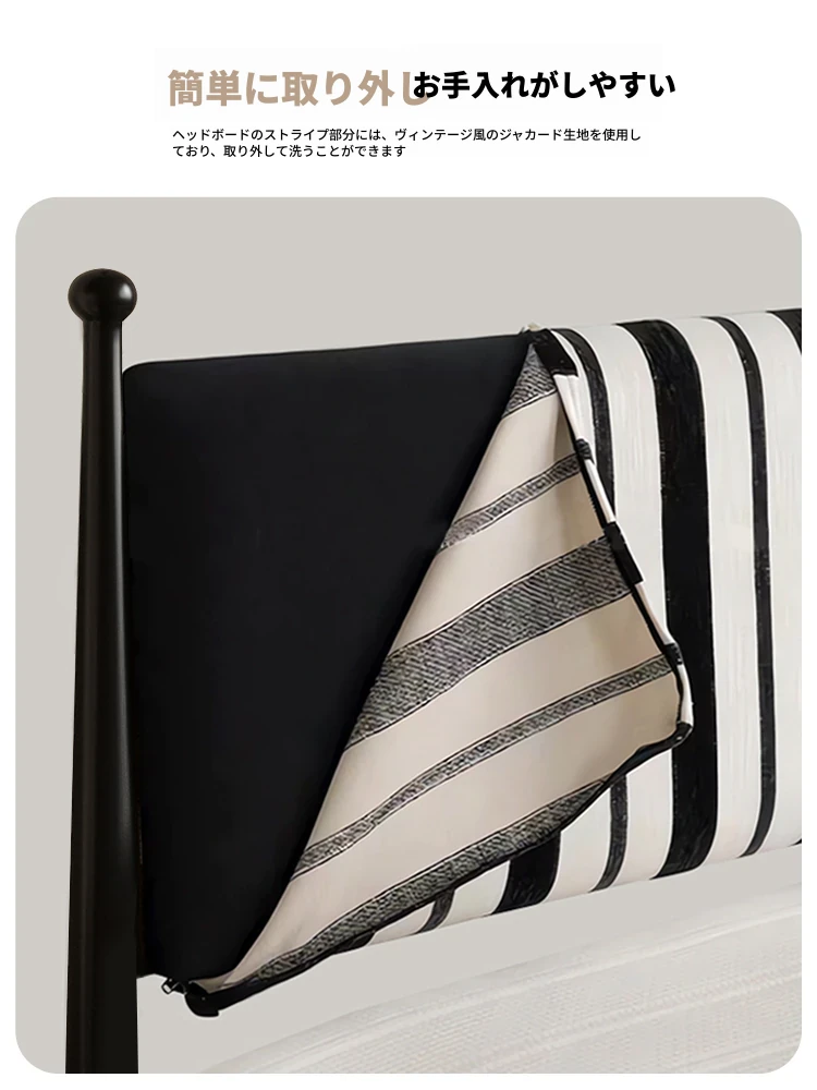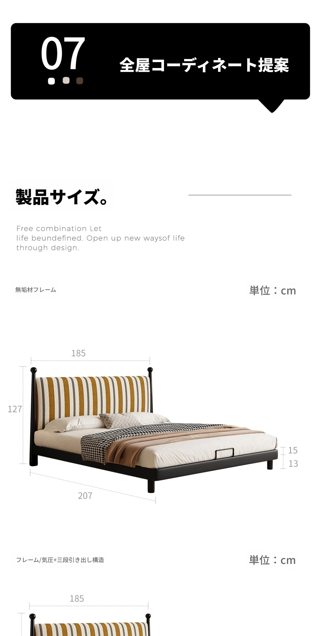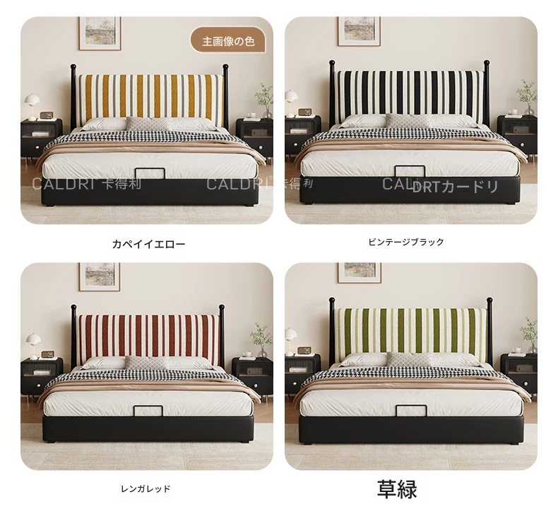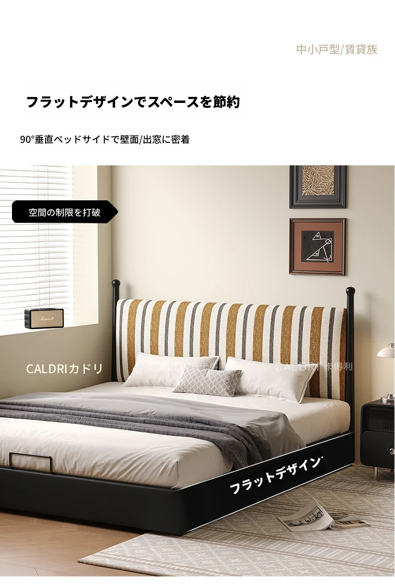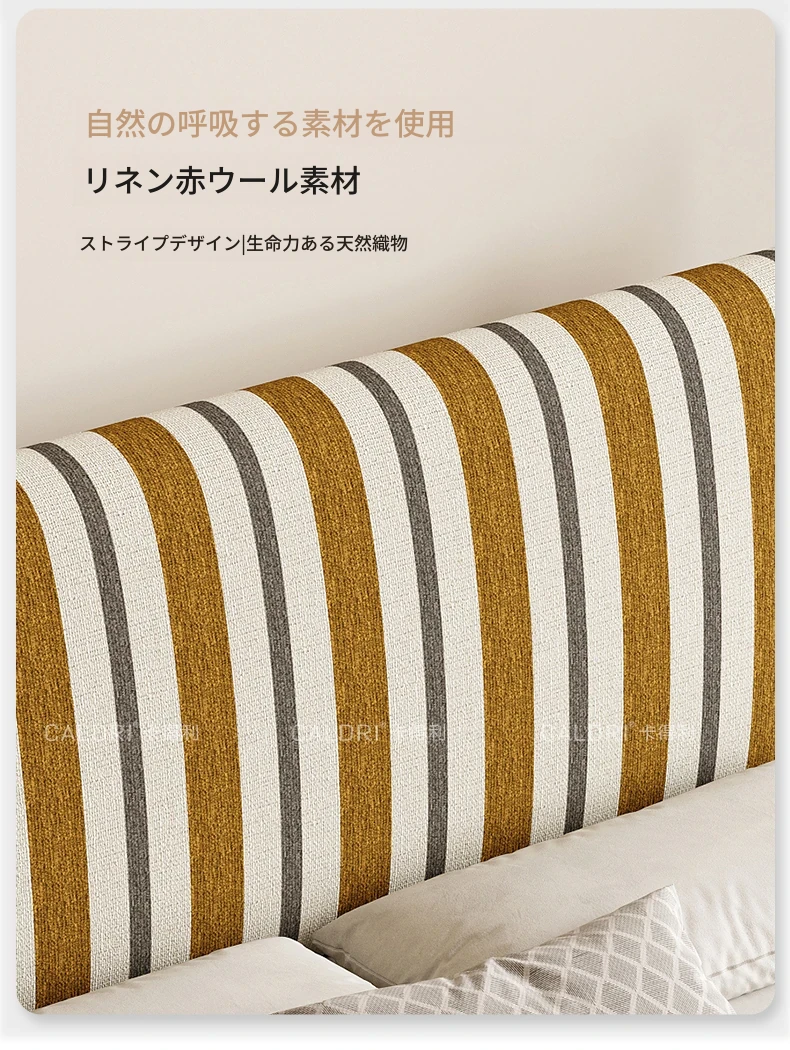 カデリ中古レトロスタイル薄型ヘッドボード取り外し可能なストライプ布製フルソリッドウッドダブルベッド、収納付き主寝室用大床。おしゃれで実用的、あなたの寝室を魅力的に演出します!