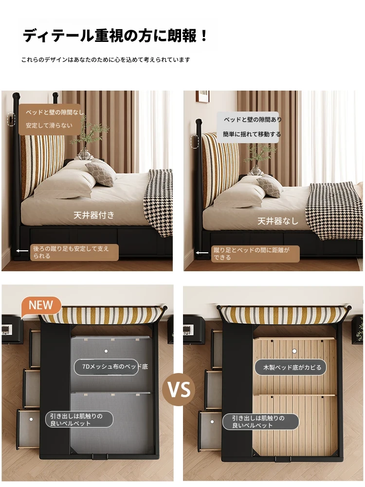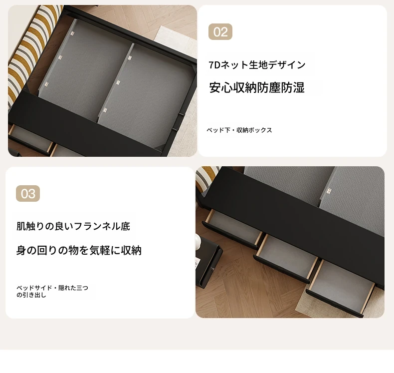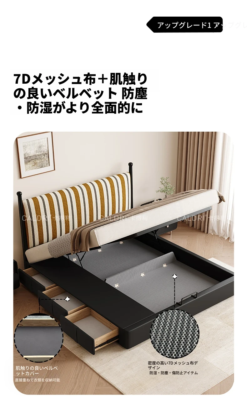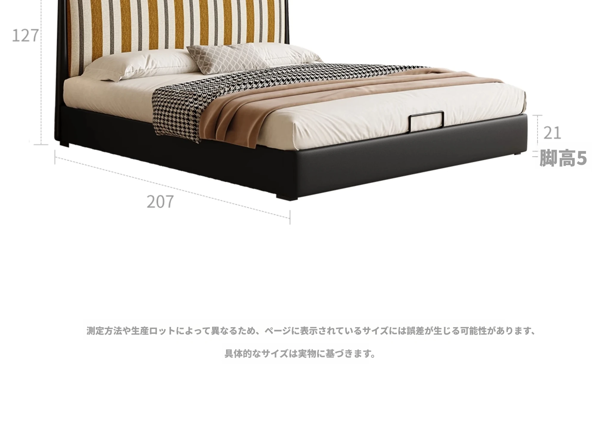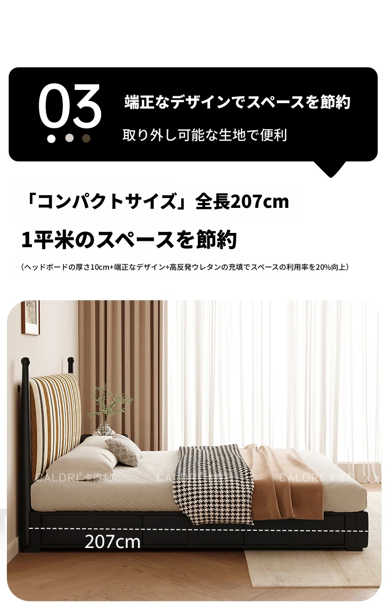 カデリ中古レトロスタイル薄型ヘッドボード取り外し可能なストライプ布製フルソリッドウッドダブルベッド、収納付き主寝室用大床。おしゃれで実用的、あなたの寝室を魅力的に演出します!