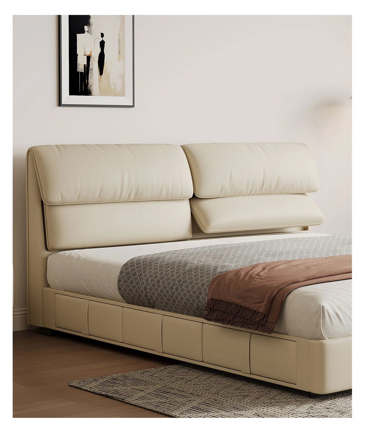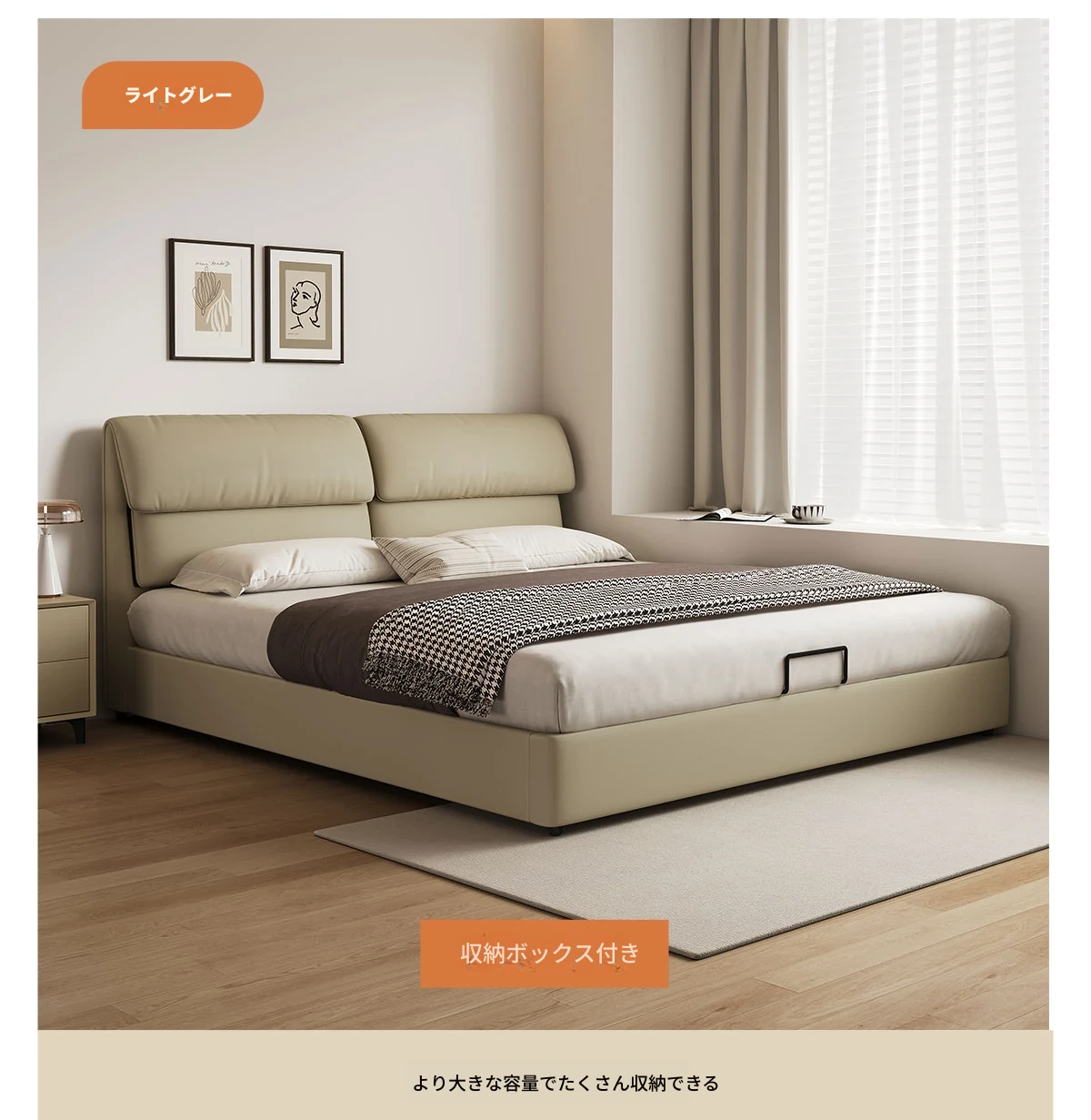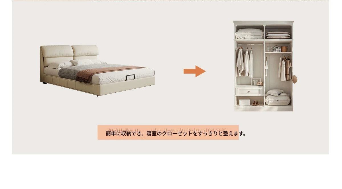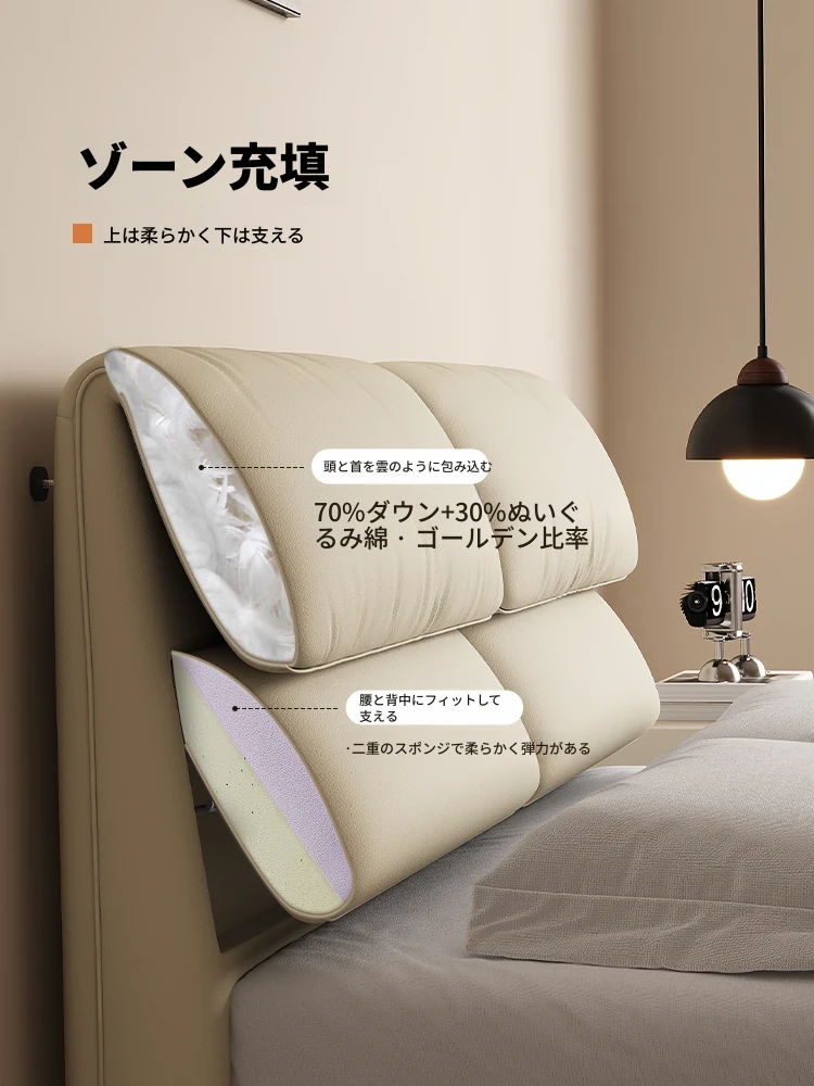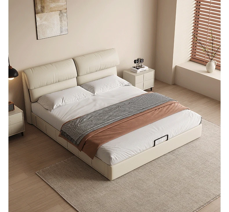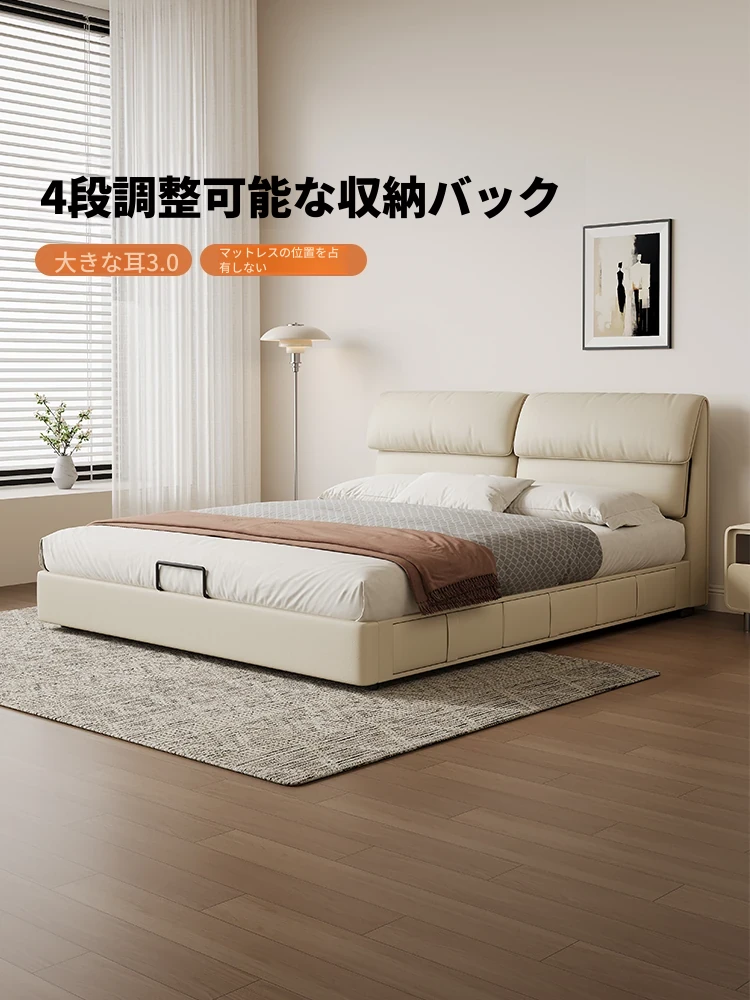 カデリ大象耳ベッド - モダンでシンプルなデザイン、収納力抜群の高級ダブルベッド。スタイリッシュな本革製で、主寝室にぴったりの上質さを提供します。おしゃれな空間を演出し、快適な睡眠をサポート!