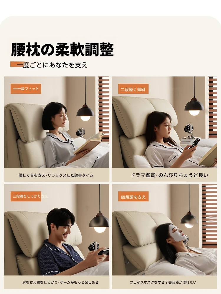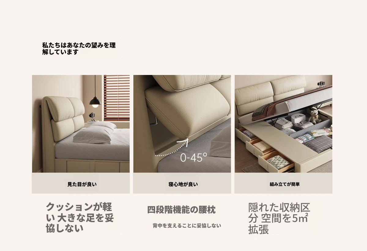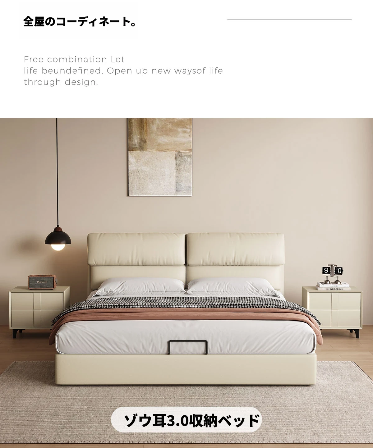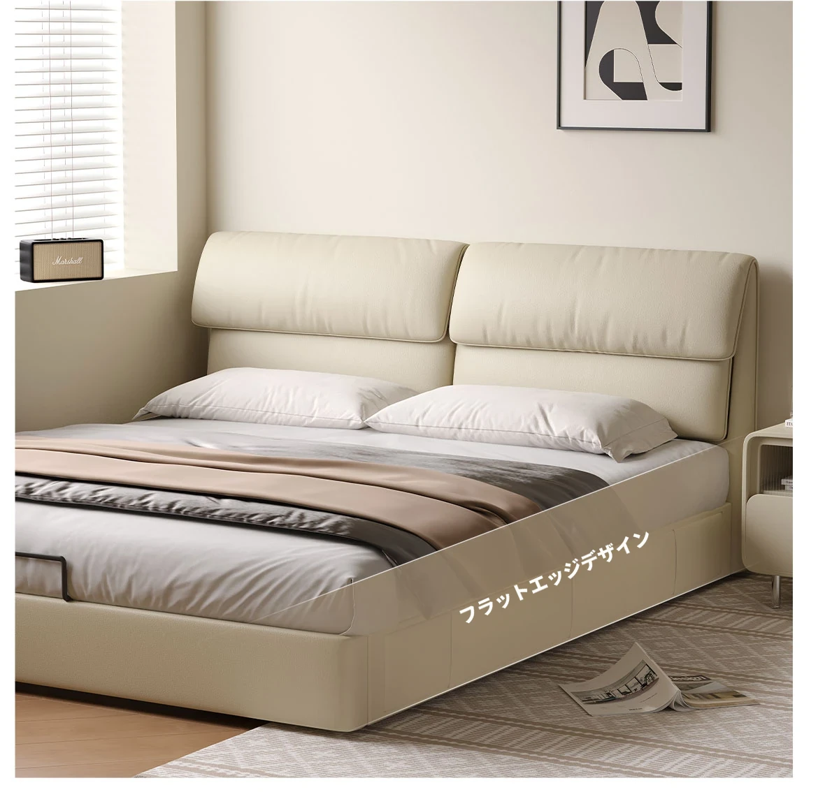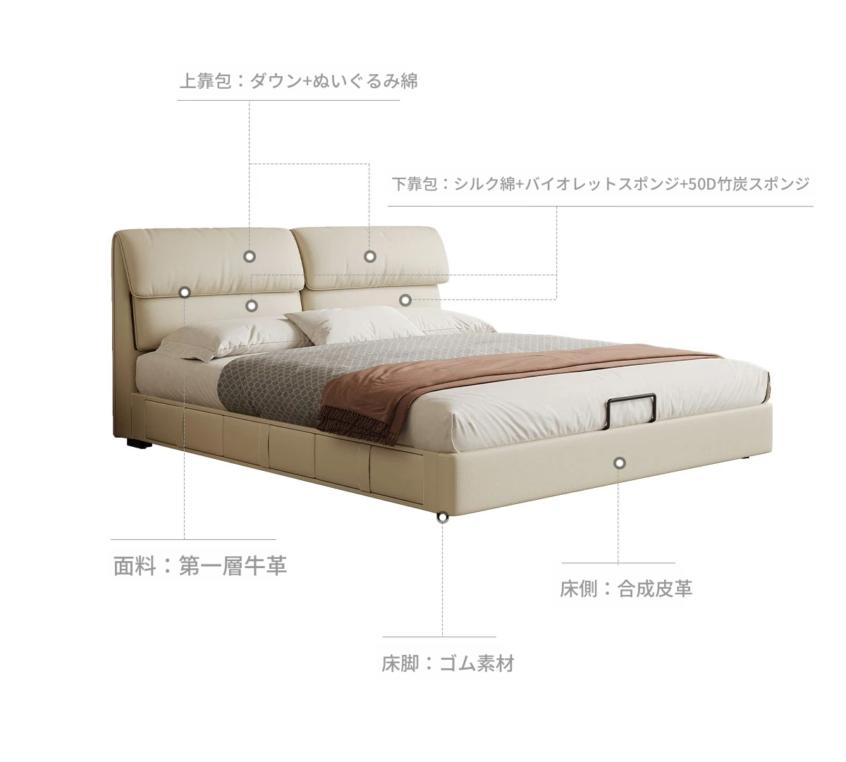 カデリ大象耳ベッド - モダンでシンプルなデザイン、収納力抜群の高級ダブルベッド。スタイリッシュな本革製で、主寝室にぴったりの上質さを提供します。おしゃれな空間を演出し、快適な睡眠をサポート!