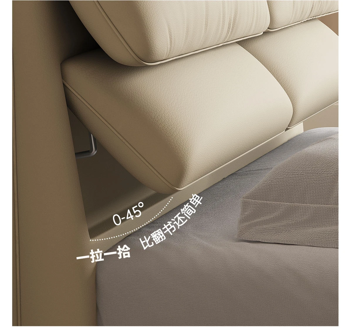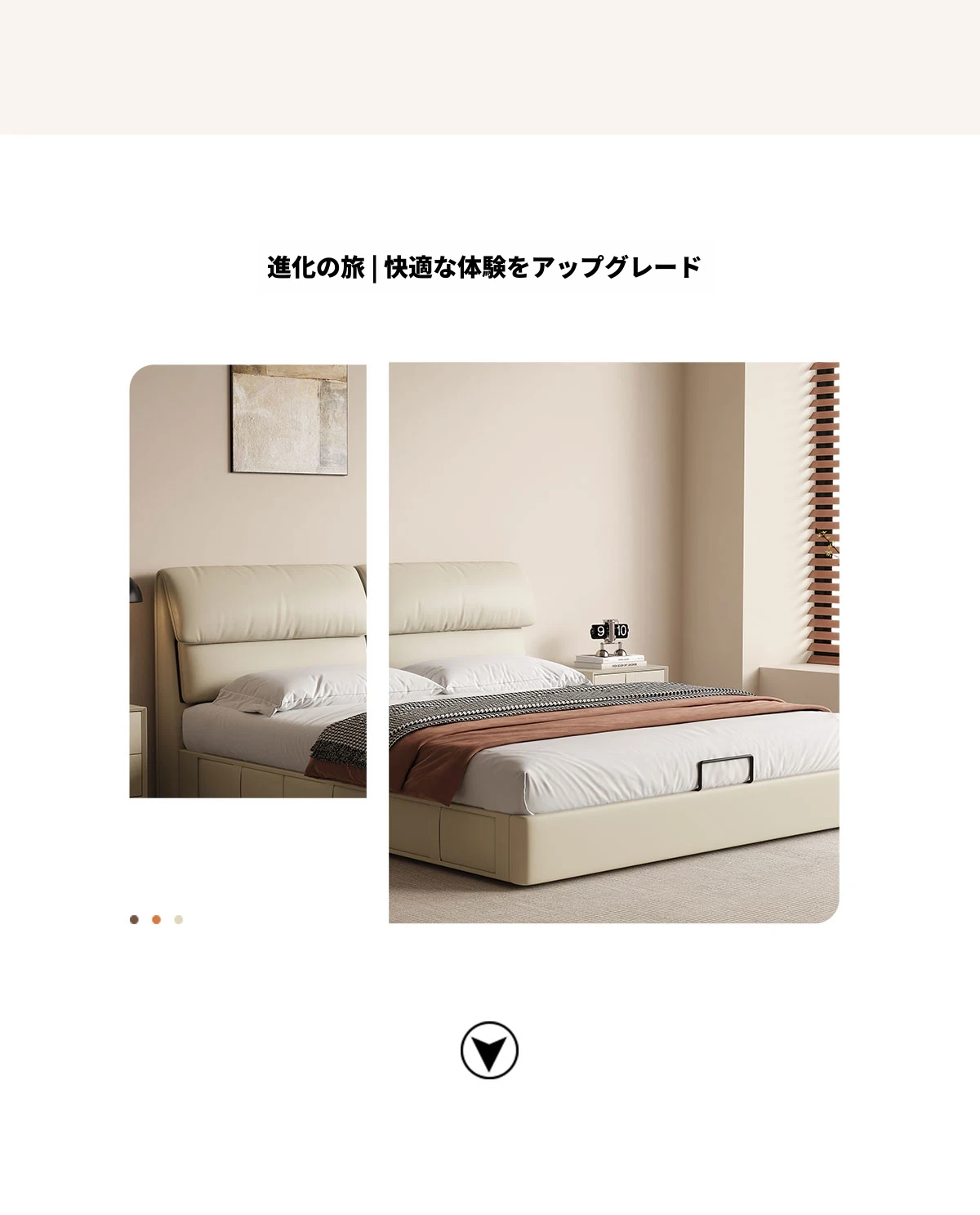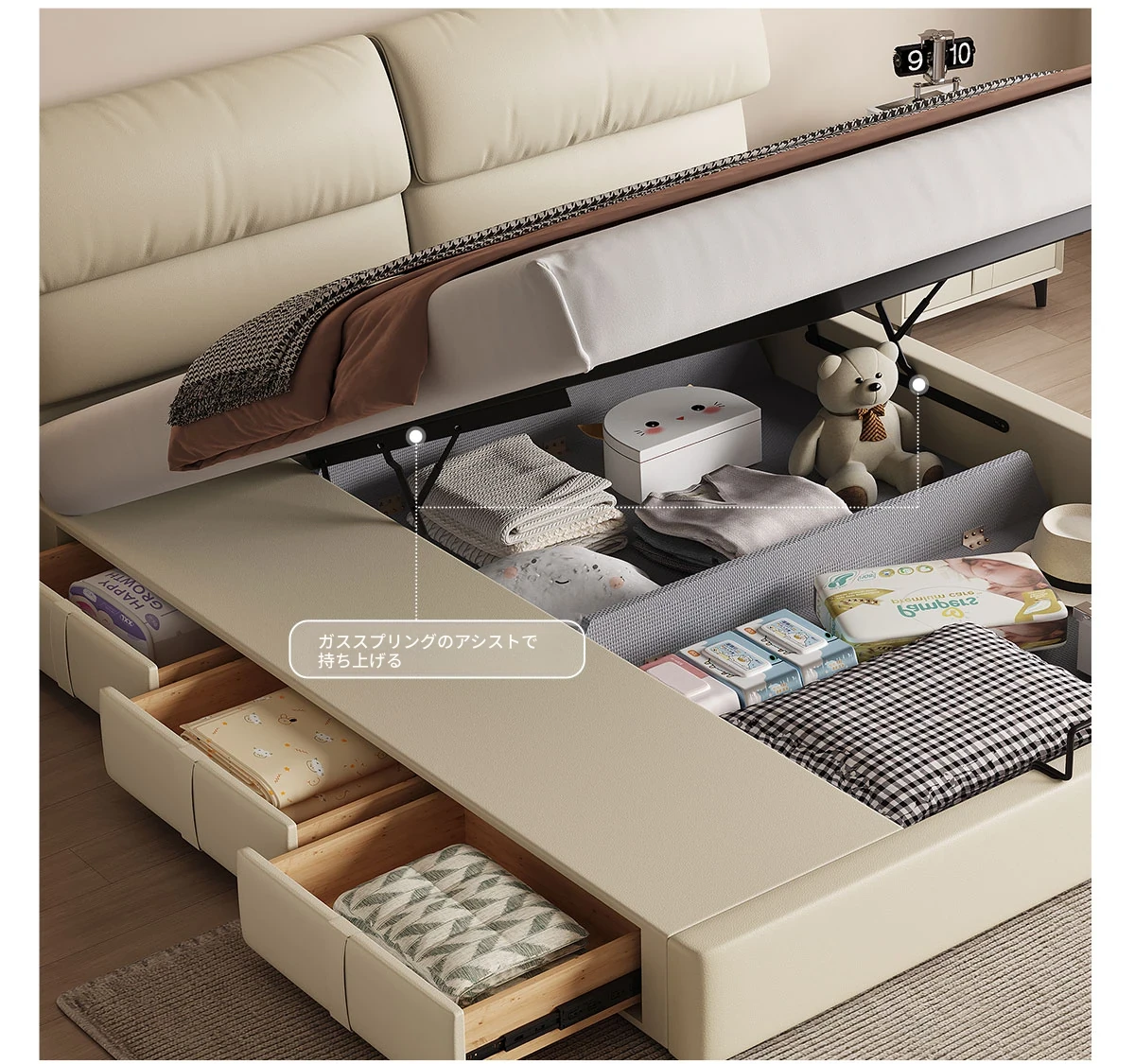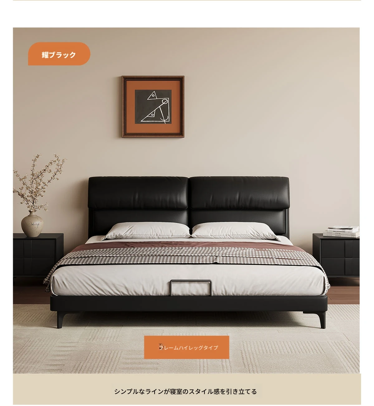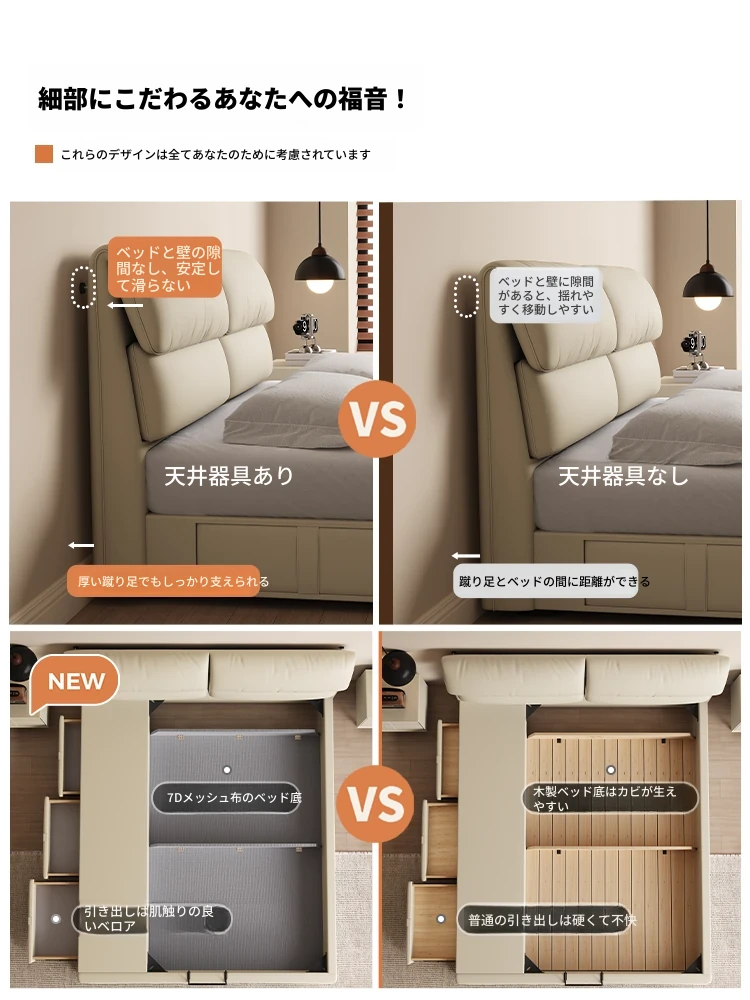 カデリ大象耳ベッド - モダンでシンプルなデザイン、収納力抜群の高級ダブルベッド。スタイリッシュな本革製で、主寝室にぴったりの上質さを提供します。おしゃれな空間を演出し、快適な睡眠をサポート!
