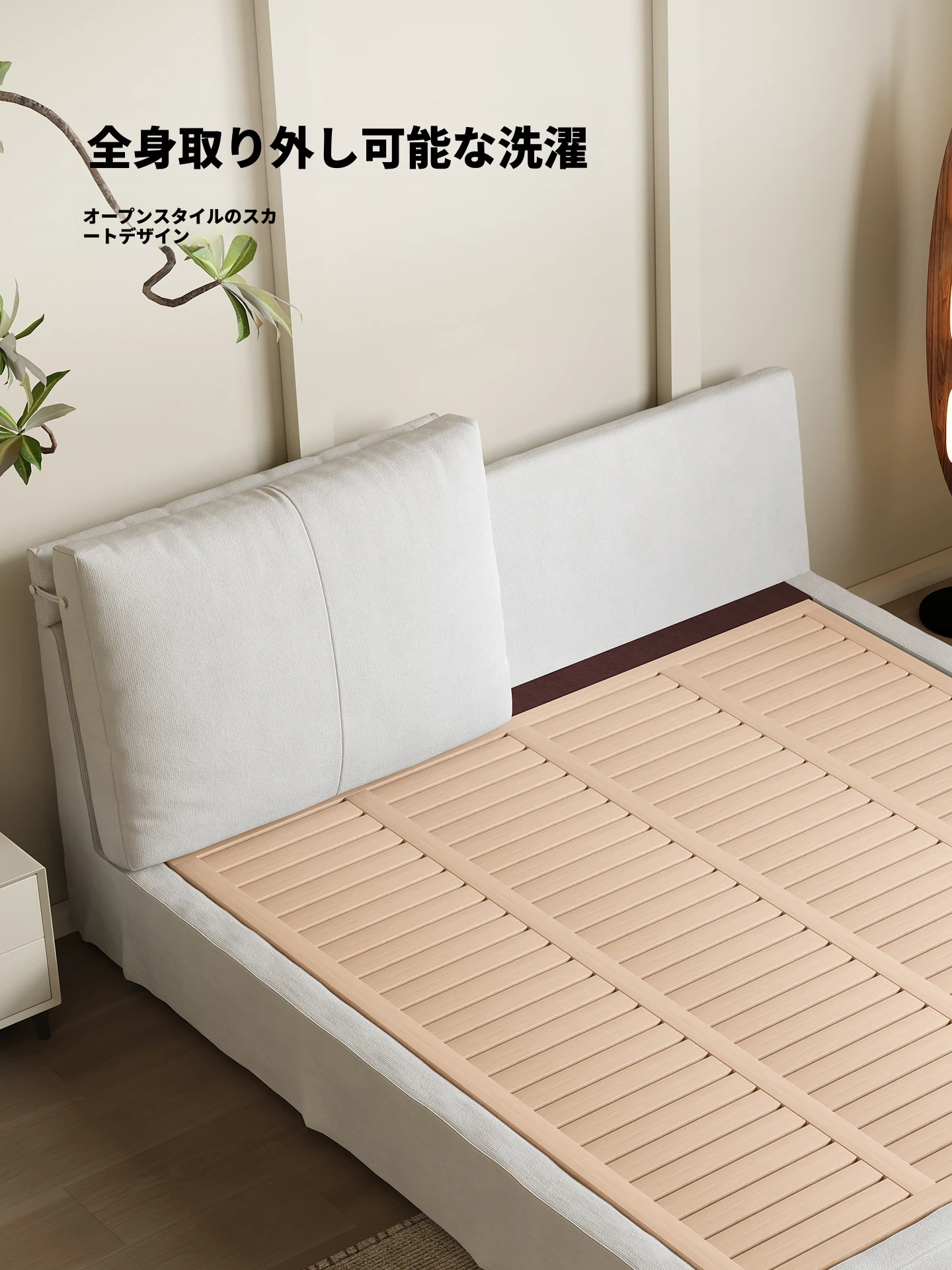 豪華版:麻布ベッド【16列スチールウッドスラットフレーム】+ナイトスタンド*1
