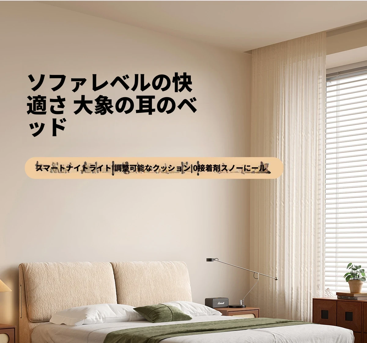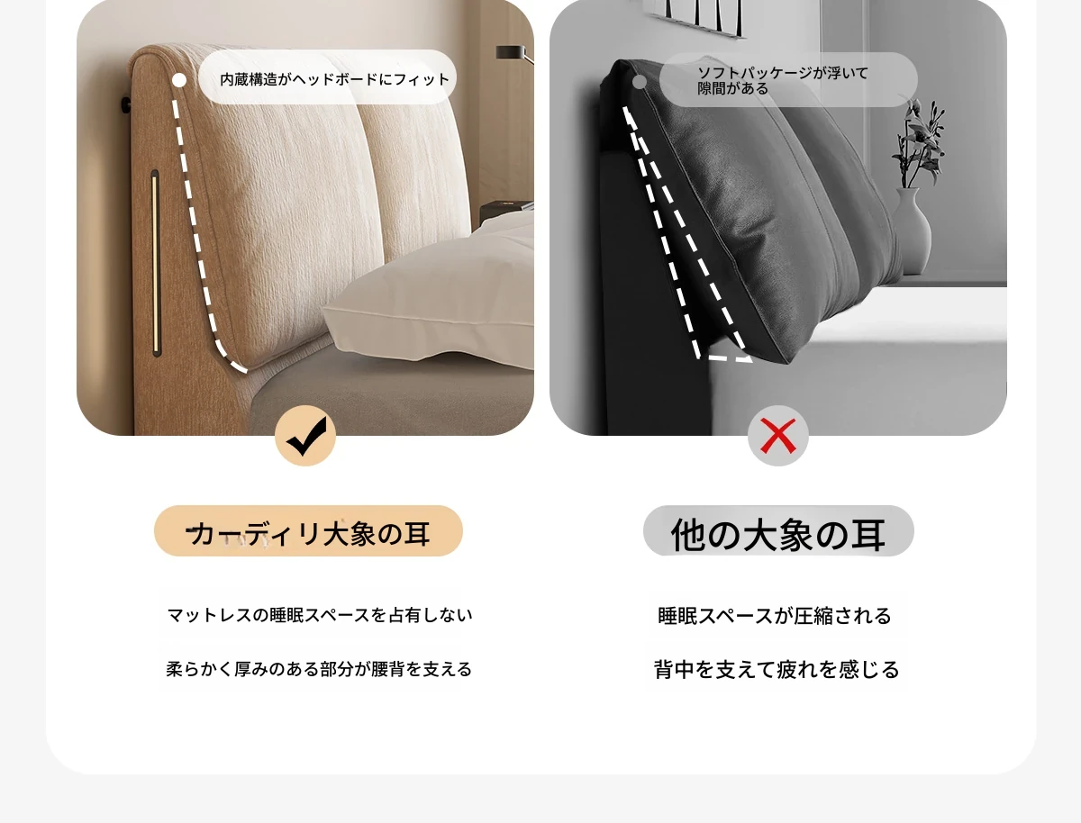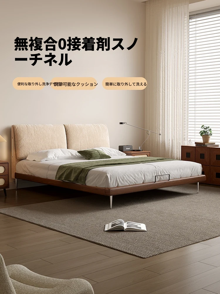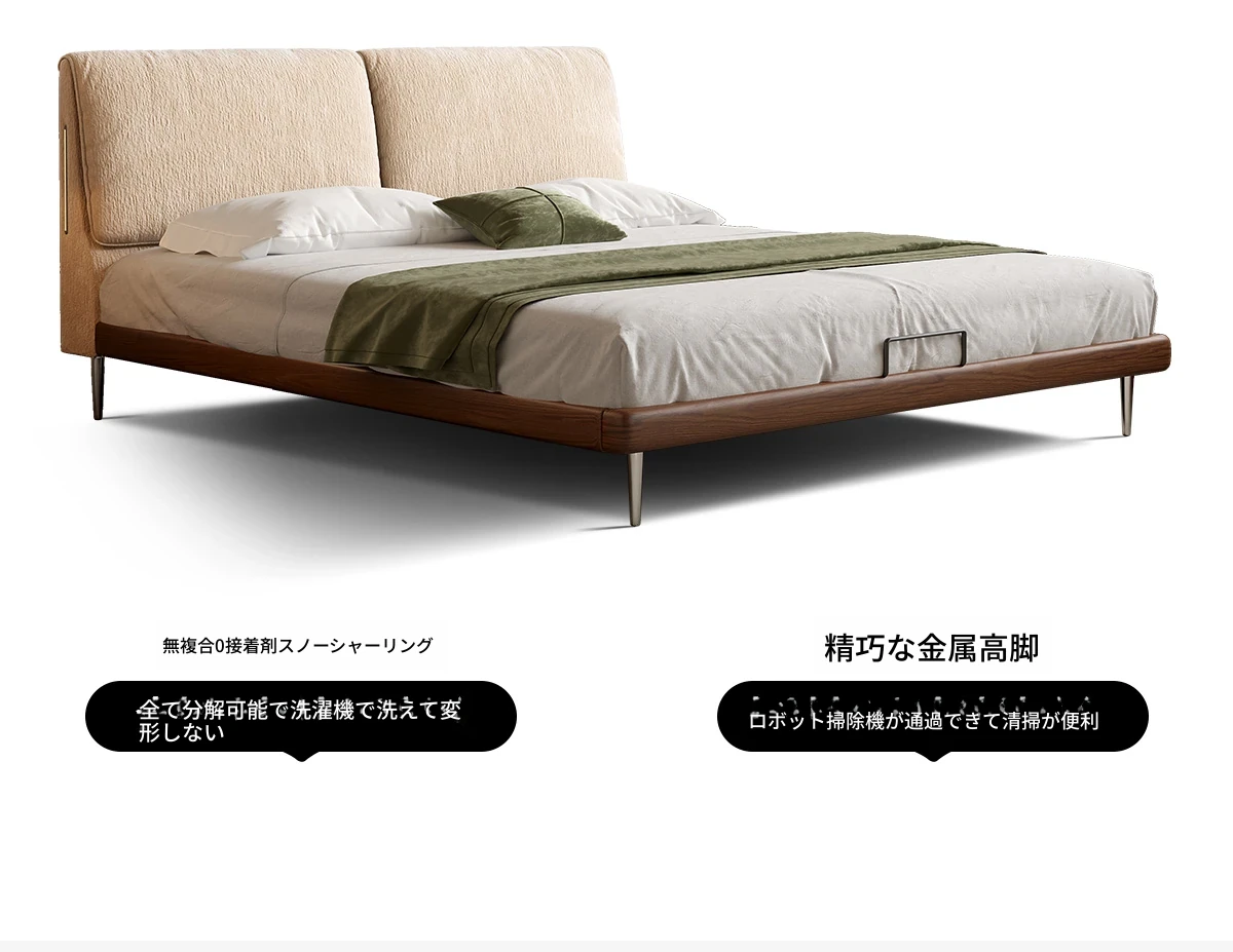 カデリ大象耳のベッド - モダンでシンプルなデザイン、雪ニール素材使用、主寝室にぴったりなダブルサイズ、小さな部屋にも最適な薄型ヘッドボード、天然木と布地の組み合わせで快適さを追求。