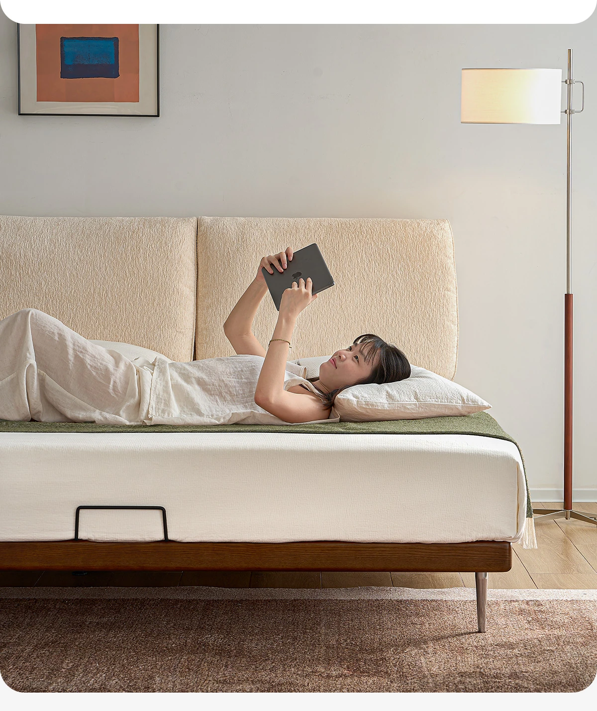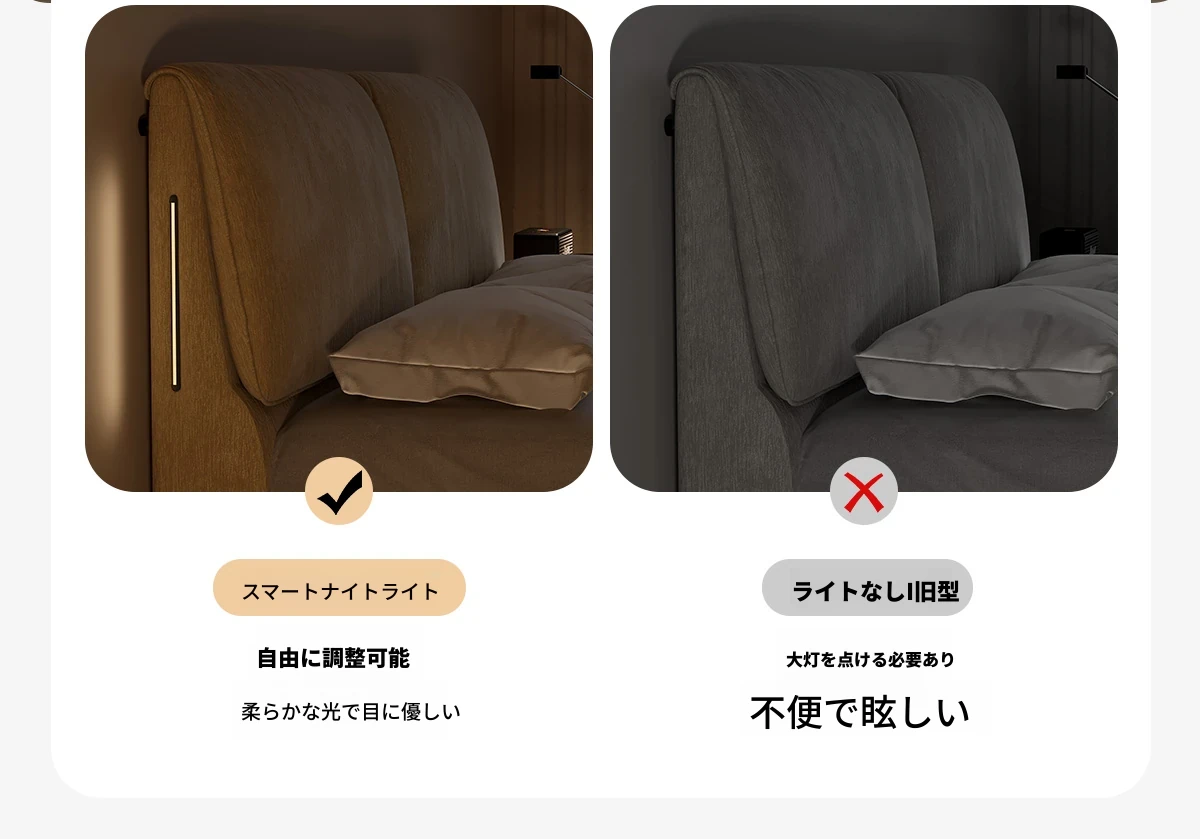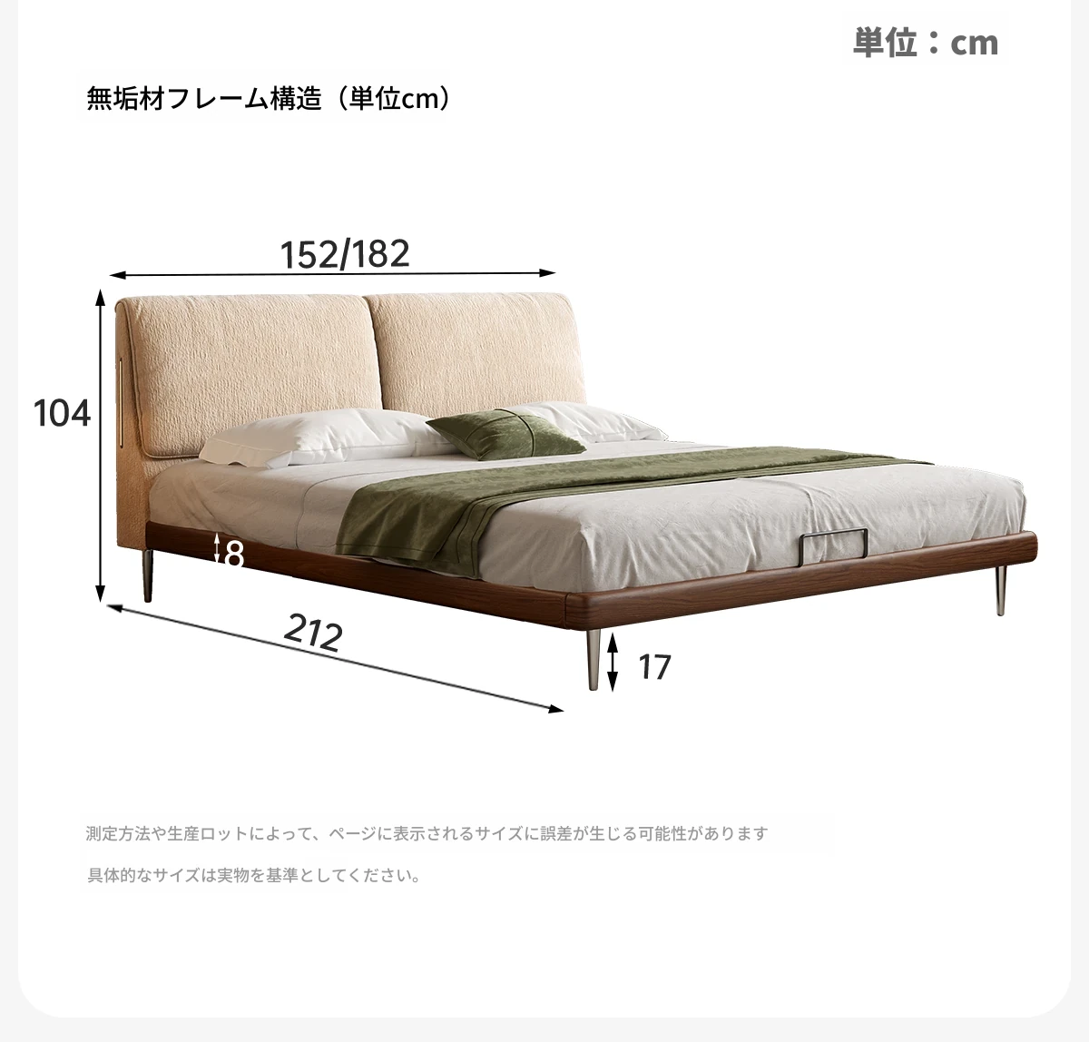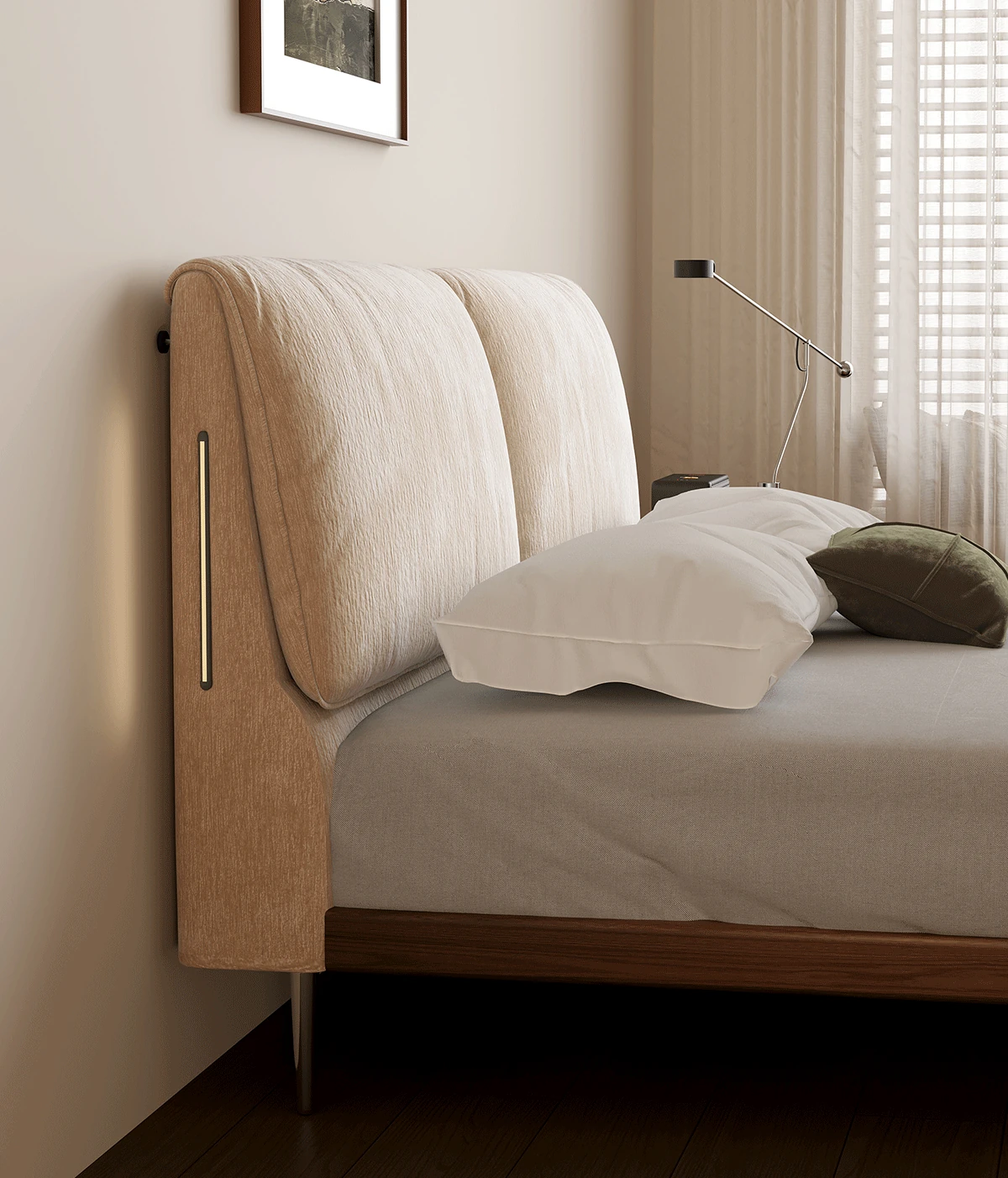 カデリ大象耳のベッド - モダンでシンプルなデザイン、雪ニール素材使用、主寝室にぴったりなダブルサイズ、小さな部屋にも最適な薄型ヘッドボード、天然木と布地の組み合わせで快適さを追求。