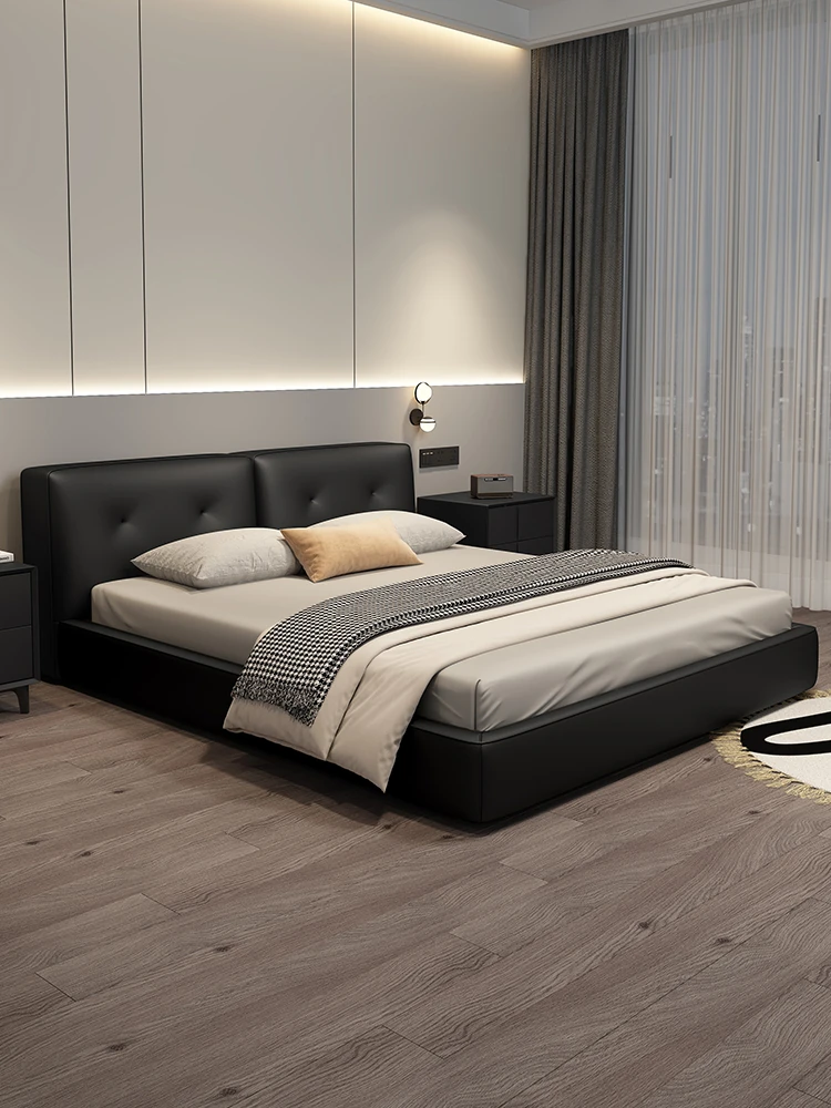 カデリ ブラック モダン ミニマリスト ダブルレザー ソフトパッキング ストレージ機能付きベッド - 高級感あふれるイタリアンスタイルの主寝室にぴったり!シンプルで洗練されたデザインで、贅沢なひとときをお楽しみください。