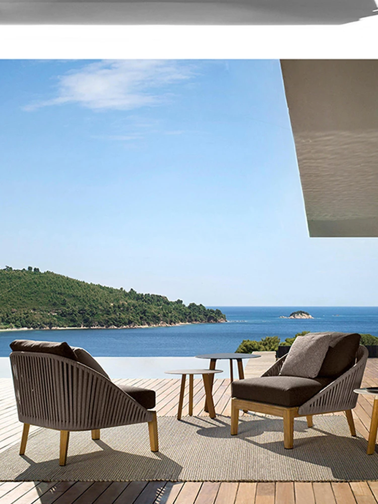 モ家アウトドアラタン編みソファー|無垢材使用の庭園デザイン|ヴィラ・ホテル向け|チーク材ラタンチェア|サンルーム・ガーデン家具に最適!心地よいひとときを演出します。