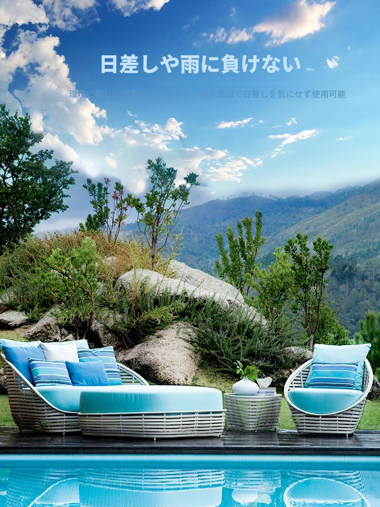 モ家のアウトドアソファセット - ヴィラやバルコニーに最適なリラックス空間を演出!高級感あふれるラタン編みのデザインで、ホテルや庭園にもぴったりなクリエイティブな家具。快適なひとときをお楽しみください!