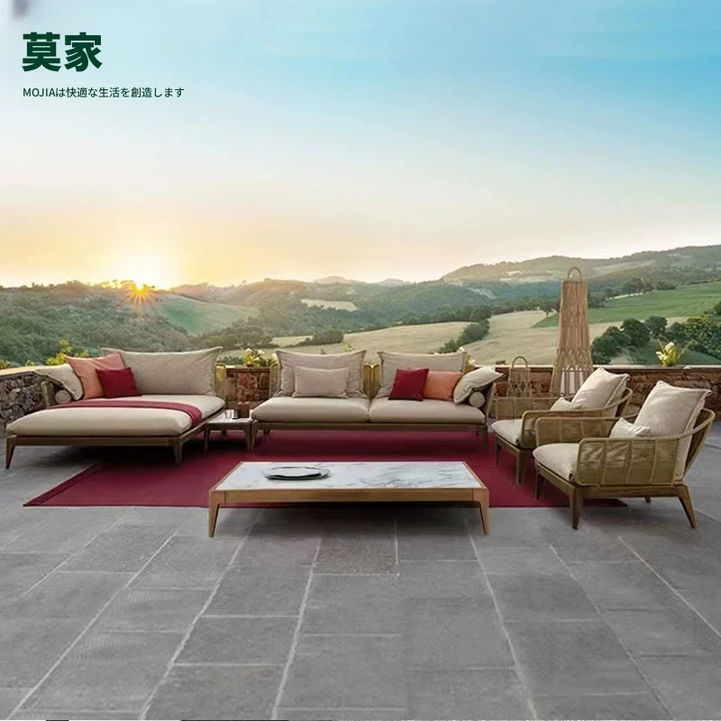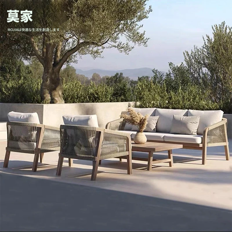 モ家の北欧スタイル屋外ソファ、ラタン編み・無垢材・アルミ合金製、ガーデン・ヴィラ・ホテル向けデザイン、チークロープチェア家具。快適でスタイリッシュなアウトドア空間を演出!