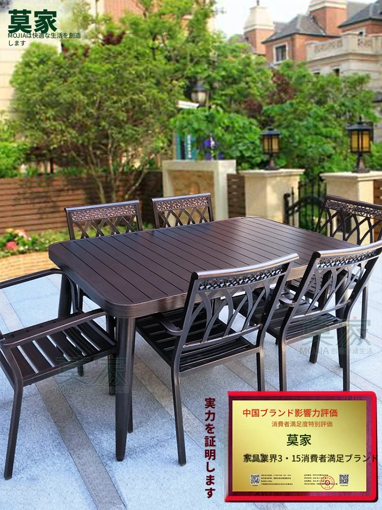 モ家のアウトドアテーブルセット - 中華風レトロデザイン、庭やテラスにぴったりなプラスチック木製テーブル&チェア。別荘やガーデンでの屋外食事を楽しむための理想的なアイテム!